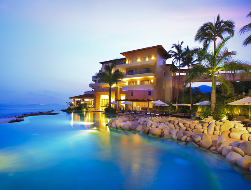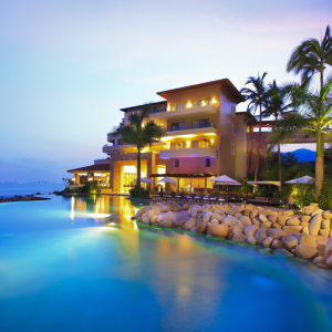 This stunning luxury retreat resort on Mexico's Banderas Bay is surrounded by the tropical green jungle of the Sierra Madre Mountains and gorgeous blue waters of the Pacific Ocean. This elegant resort is one of Mexico's most luxurious optional all-inclusive resorts in Puerto Vallarta. All suites at this luxury beach resort feature stylish decor, private terraces and whirlpool tubs. Guests can dine and enjoy mouthwatering gourmet cuisine and enjoy breathtaking ocean views. This paradise is the perfect escape for families, honeymoons, and love birds.