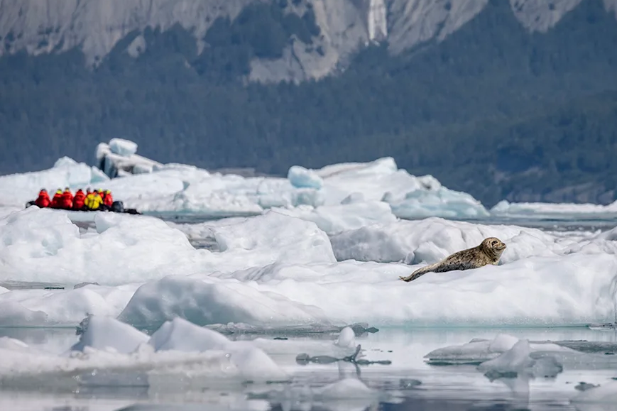 Today is an exploration day in Icy Bay. Three glaciers – Guyot, Yahtse, and Tyndall – each feed ice into the bay’s waters to give it its name. If conditions allow, you’ll explore in HX's small expedition boats or by kayak, immersing you in the remarkable beauty of this icy landscape. From Icy Bay, you can admire striking, jagged Mt. St Elias. Known for its steep vertical relief, it is the second tallest peak in the US and third tallest in the US and Canada at over 18,000 ft. In the Gulf of Alaska, you’ll scout for humpback whales, orcas, sea otters, and harbour seals which are often seen in these waters.