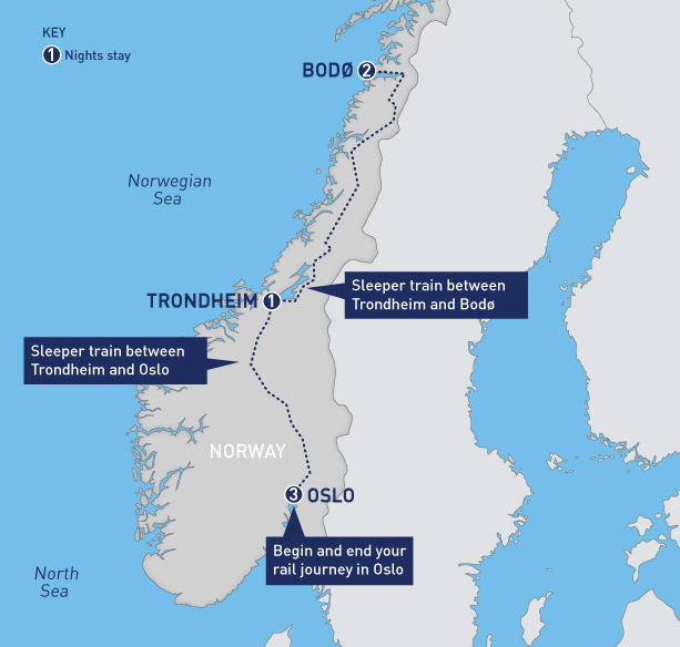 Board your train from Bodo to Trondheim, then connect onto an overnight train from Trondheim to Oslo. (Overnight onboard the train)