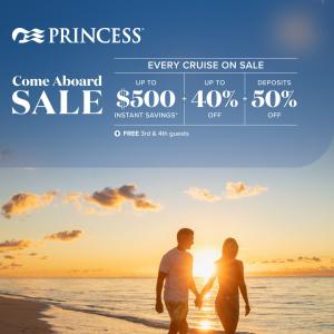 Life's too short for 'maybe next year.' This is the moment to book your dream voyage and save big with Princess Cruises. The Come Aboard Sale is here and EVERY cruise is on sale with up to 40% off, up to $500 instant savings, 50% off deposits and complimentary 3rd & 4th guests (on select sailings). Chase the sun in the Caribbean, navigate the glaciers of Alaska or discover the charm of European towns. This limited time offer won’t last, so book now and come aboard — you have exploring to do.