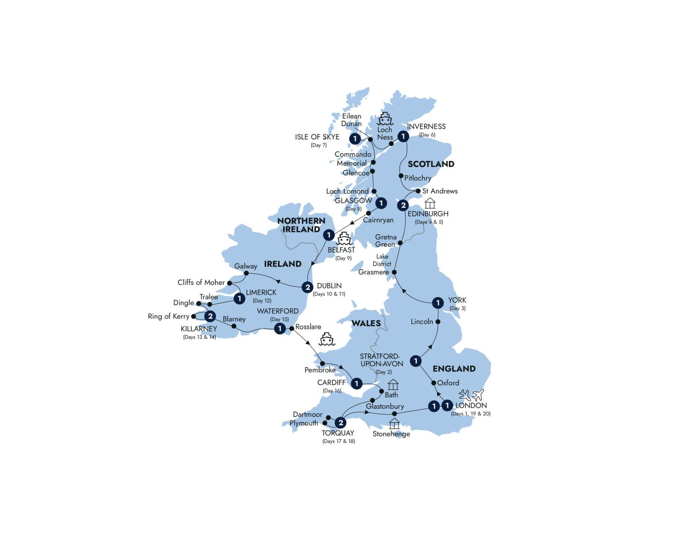 Travel alongside the Mountains of Mourne before crossing the historic Boyne Valley, site of the battle where William of Orange defeated the forces of Catholic King James. Continue to Dublin, Ireland's 'fair city where the girls are so pretty. Experience Ireland's national and world-famous drink in the Guinness Storehouse. Gain a fascinating insight into the history and traditions behind its production.