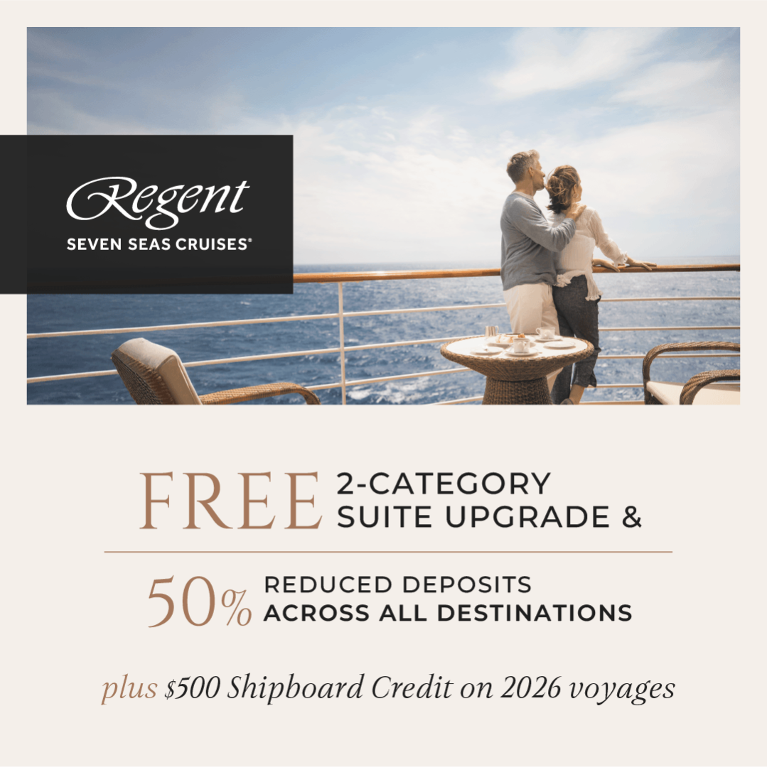 Indulge in all the amenities that come with your COMPLIMENTARY 2-CATEGORY SUITE UPGRADE and 50% REDUCED DEPOSITS on every ship and across every destination. To enhance your journey even further, enjoy up to $500 SHIPBOARD CREDIT per suite on select 2026 voyages, perfect for spa indulgences, enriching Regent Choice shore experiences or exclusive moments on board.