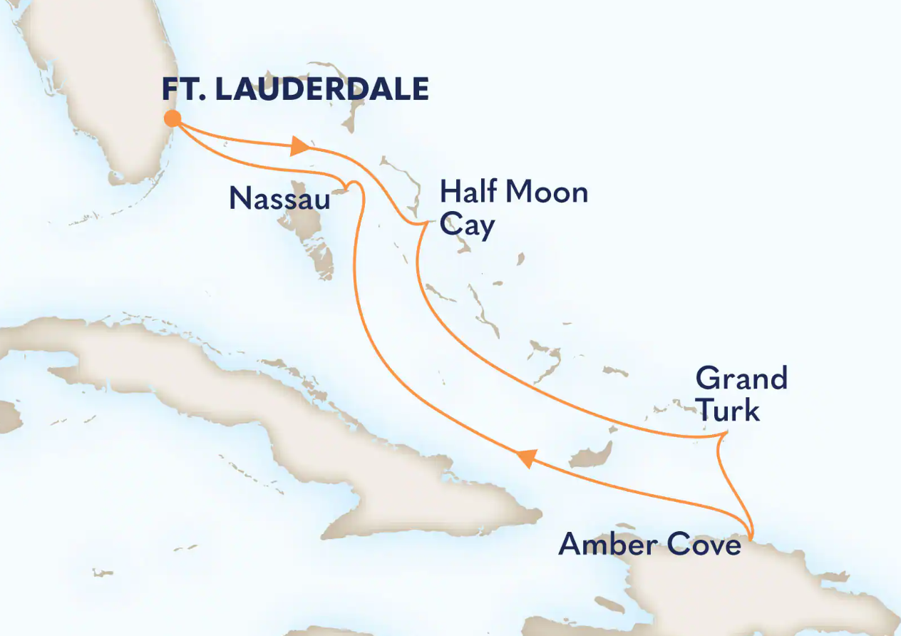 Depart Ft. Lauderdale for all the colors of the Caribbean, from RelaxAway, Half Moon Cay’s turquoise lagoon to Grand Turk’s rainbow reefs and Nassau’s pink flamingoes.
