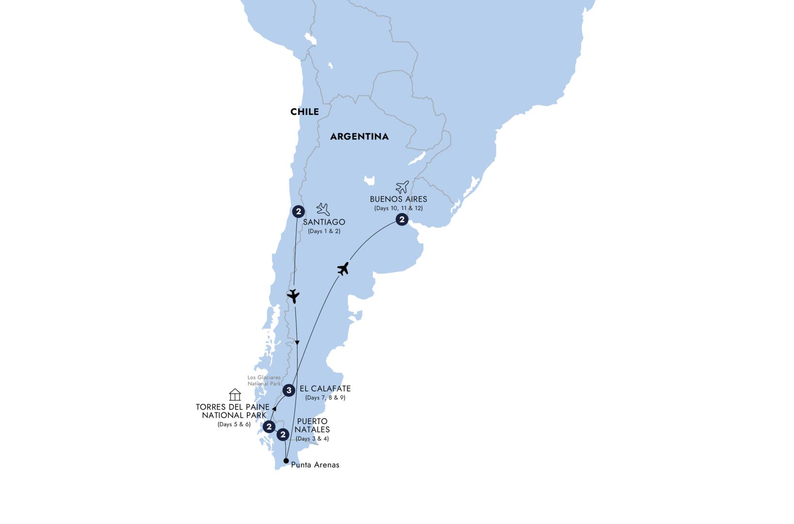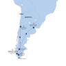 Travel across the vast Patagonian landscapes as you journey from Chile into Argentina, heading toward the frontier town of El Calafate. Named after the native Calafate berry - a small, dark blue fruit said to ensure your return to Patagonia - this town is the gateway to Los Glaciares National Park. Along the way, watch the scenery shift from windswept steppe to glacial lakes and rolling hills, revealing the scale and solitude that define this southern region. With the Andes behind you and new landscapes ahead, the journey offers a striking transition between two of South America's most remarkable wildernesses.