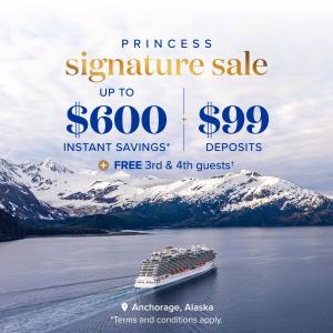 GENERAL TERMS APPLICABLE TO ALL OFFERS IN THIS ADVERTISEMENT(“Offer(s)”): Available to legal residents of North America, 21+. Offers only available on select cruises, on a limited availability, are capacity controlled (regardless of stateroom availability), and may not be combined with other offers or promotions (aside from those listed herein). Other exclusions may apply; void where prohibited. Changes or refunds may not be permitted. Offers and their parts (if any) are not transferable, not substitutable, and not redeemable for cash. Princess Cruise Lines, Ltd. (“PCL”) is not responsible or liable for any errors, including printing or other errors. PCL may change or revoke Offers at any time. A non-refundable deposit is required for all stateroom guests. All values quoted in USD. Offers valid on bookings made 2/17/26 - 3/17/26. Please refer to princess.com for terms, conditions, and details that apply to all bookings.