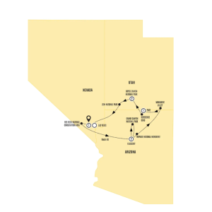 Traveling back to Vegas today, you'll make one final stop at Zion National Park. Marvel at the soaring red and white cliffs and vast canyons that stand in stark contrast to the soft wildflower meadows and hanging gardens than can also be found here as a result of the park's lower elevation compared to the others. Continue along the Virgin River Gorge for your final drive, reflecting on the incredible sights and experiences you've witnessed over the past seven days. Your trip ends at Harry Reid International Airport at 5:00 PM, or at the Costsaver post hotel for those extending their stay in Sin City.