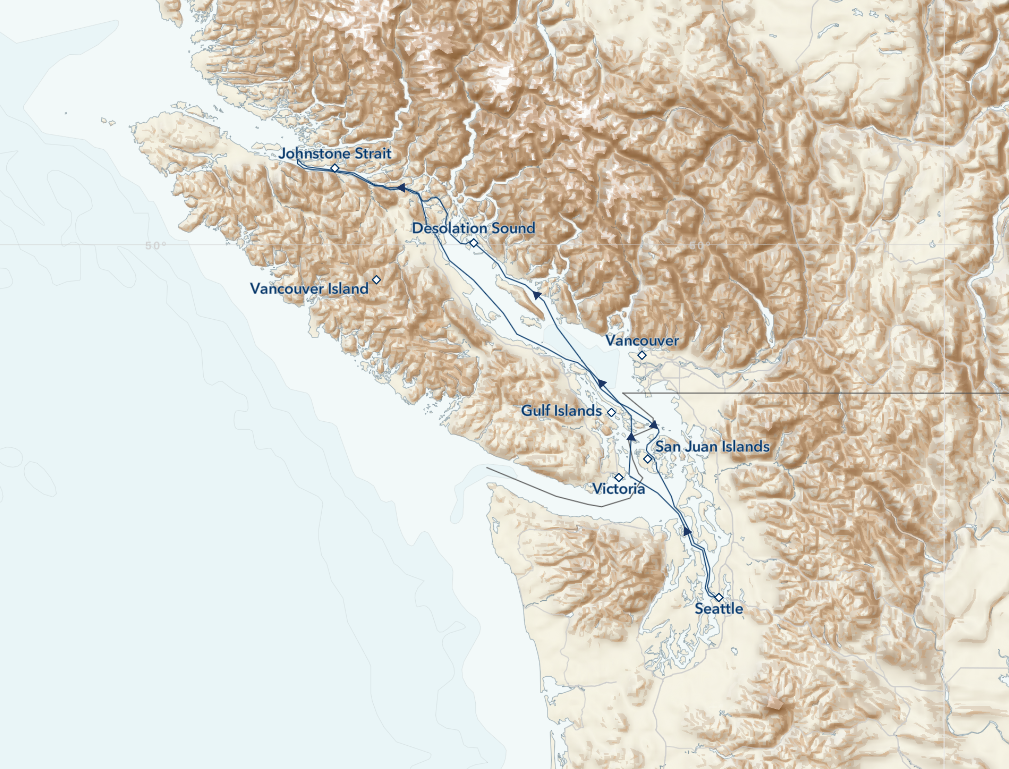 Discover the pristine wilderness, First Nations history, and seaside communities of the Pacific Northwest. Trace the coast from Seattle to British Columbia to explore isolated coves and archipelagos by kayak and Zodiac, and venture ashore to hike through misty forests.Explore among lush Islands, keeping an eye out for marine mammals and bald eagles; visit picturesque coastal towns; and learn about the native cultures that call this region home.