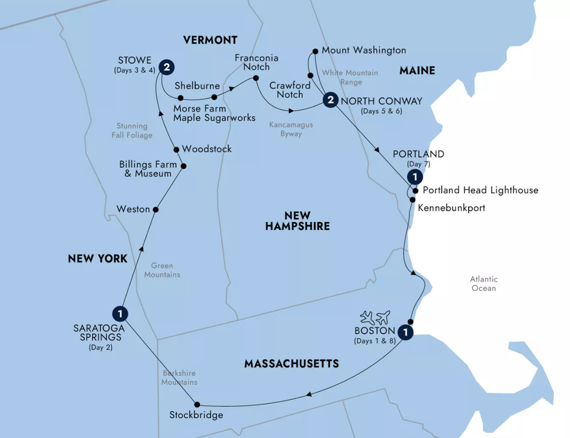 Embrace the beauty of New England during this 8-Day guided tour. Behold Boston, one of the oldest cities in the U.S. and where much of the country was formed; here, you will traverse part of the red-brick Freedom Trail, where you will see the hall that housed the country’s first-ever town meeting and many more historic sites. Admire the bronzing leaves of Vermont’s lush trees as you travel to Stowe, where the real Von Trapp family of ‘The Sound of Music’ chose to live — and where you will stay. In Montpelier, visit a maple syrup farm where you can taste the sweet golden liquid tapped straight from the trees. Ride a gondola at Loon Mountain Resort into New Hampshire’s White Mountains and see as far as Canada. See Maine’s oldest lighthouse in Portland, then celebrate your trip with a decadent fresh lobster dinner.