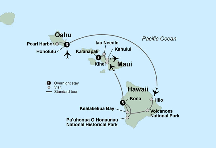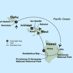 Embrace the spirit of “Aloha” on a leisurely 3-island tour of Hawaii featuring 3-night stays each in O'ahu, Big Island (Kona) and Maui. Remember Pearl Harbor and visit the USS Arizona Memorial. Take in the natural beauty of Hawai'i Volcanoes National Park on the Big Island. Admire the hula dance, an ancient Polynesian art form. Visit a coffee farm in Kona and learn about the coffee bean’s journey from tree to cup. Uncover the beauty, culture and traditions of all three islands.