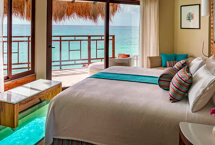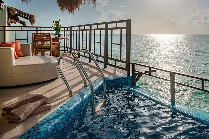 Discover Mexico's first overwater bungalows on the best beach in Riviera Maya. Palafitos Overwater Bungalows at El Dorado Maroma are a cluster of 30 exclusive, private bungalows sitting right over the turquoise waters of Maroma Beach. Every facet of these exclusive suites is designed to highlight the surrounding beauty. Direct ladder access to the ocean and glass floors are just the beginning of overwater living. Watch the sun rise and set in a stunning display of colors from your private deck. Take a dip in your private infinity pool offering picture-perfect views of the sparkling sea. Rinse off in your private outdoor shower and let your personal butler take care of the rest as you relax in absolute bliss.