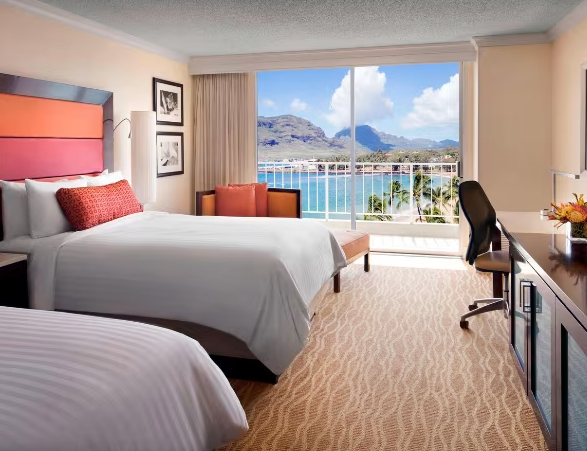 The Royal Sonesta Kaua'i Resort Lihue is centrally located on Kaua`i's beautiful Kalapaki Bay, and is distinguished by its majestic waterfalls, blue lagoons and lush tropical surroundings. Surround yourself with the stunning beauty and splendor of Hawaii's Garden Isle at this enchanting beachfront Kaua'i Resort, where the Aloha Spirit has been elegantly melded with modern amenities and gracious Hawaiian hospitality. Come and experience this 800-acre paradise, where championship golf, water sports, endless activities, and Hawaii's largest single-level swimming pool create a world of unparalleled pleasure. Each room at this resort has a view that will take your breath away, whether you choose views of the serene pool, lush garden, or the magnificent ocean. You’ll find all the comforts you need to relax and unplug, and all the tech you desire when you need to stay connected. From plasma-screen TVs to high-speed Wi-Fi, your room is thoughtfully equipped so you can be as laid-back or productive as you wish.