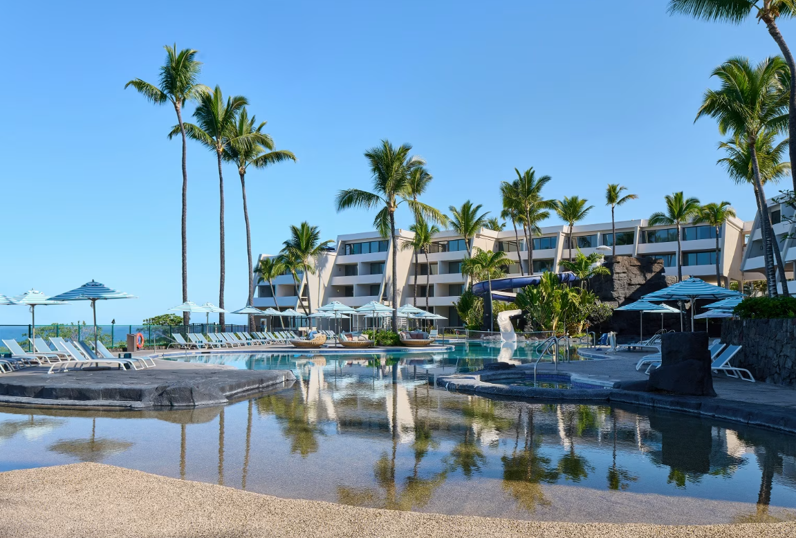 A legendary Kona resort reborn at Keauhou Bay. Perched on the cliffs offering spectacular ocean views. Newly renovated guest rooms, suites and meeting areas harmoniously unite the property's heritage with modern aesthetics. Oceanfront pool and water slide, offering family-friendly fun for both kids and adults. Feast & Fire, Kona’s premier luau experience, immerses guests in the culture and legends of the first Polynesians who set foot in Hawaii. Daily cultural activities provide an immersive journey into the vibrant history and traditions of Hawaii Island, showcasing a legacy of enduring Hawaiian hospitality. Partnered with the Pacific Manta Research Foundation, featuring Manta Talks and other ocean conservation events.