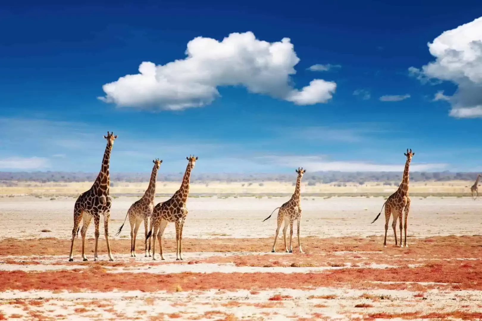 Explore Etosha National Park with thrilling game drives, encompassing its mesmerizing landscape dominated by a vast salt pan spanning 6,133 square kilometers. Known as the "Place of Mirages," it provides stunning backdrops for wildlife gatherings around natural waterholes. The park supports a rich array of wildlife, including four of the Big 5 – lion, elephant, rhino, and leopard.