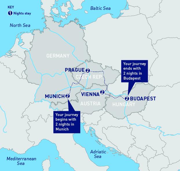 Ride the rails from west to east, taking in four historic European cities in one holiday. Travel aboard comfortable, high-speed trains as you take in the colourful history of Munich, the spire-woven skyline of Prague, the grandiose musical heritage of Vienna and the tranquil thermal baths of Budapest.