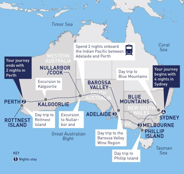 Embark on a coast to coast adventure across Australia on this 14-day train vacation. Spend three nights in Australia’s largest city Sydney, where you can enjoy the world-famous sights as well as a full-day, all-inclusive tour of the magical, mysterious Blue Mountains. From here head south to laid back Melbourne where you get a chance to watch the Phillip Island Penguin Parade at Summerland Beach. Next follow the coast aboard The Overlander Train and discover cosmopolitan Adelaide on your own, prior to boarding the Indian Pacific for two nights of Gold Class all-inclusive service to Perth via some amazing outback ghost towns.