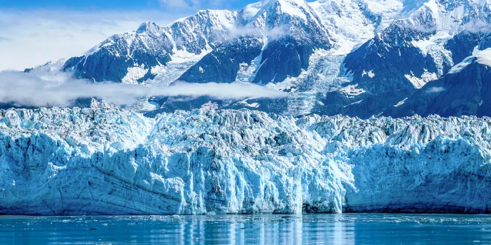 Surrounded by glacier-carved mountains and fed by the enormous Hubbard Glacier, Yakutat Bay spreads some 18 miles across at its widest point. On calm days, snow-covered slopes are reflected in the mirror-like bay, casting the entire scene in a soft, icy azure glow. Disenchantment Bay extends farther inland like a finger; at its farthest point, Hubbard Glacier creeps seaward from its source five miles away. The ice at the water’s edge began its journey from near Mt. Walsh more than 400 years ago in the early 1600s.