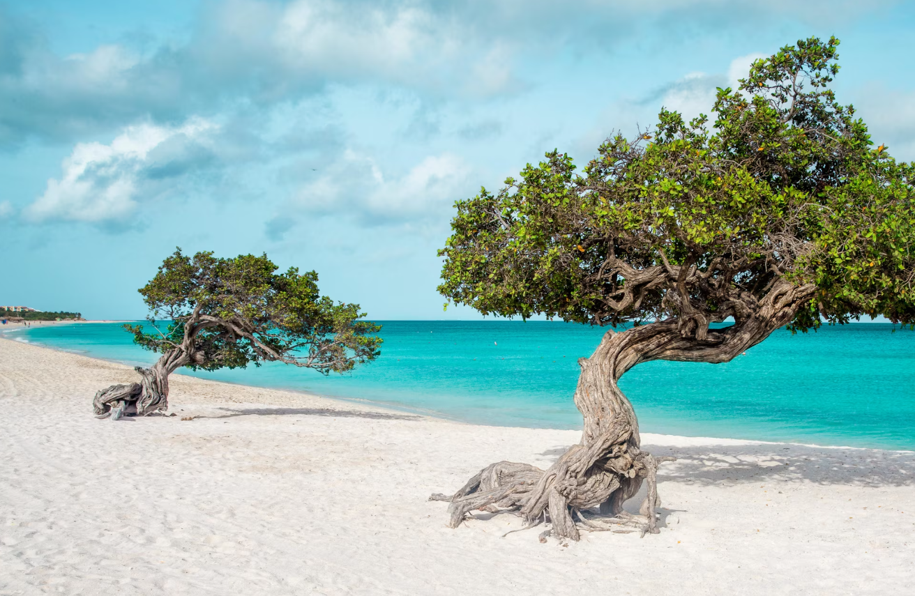 Dutch influence still lingers on this balmy Caribbean island, part of the former Netherlands Antilles until its independence in 1986. Aruba is a contrast: the island's arid interior is dotted with cactus and windswept divi-divi trees while secluded coves and sandy beaches make up its coast. Aruba's long and colorful heritage is reflected in its dialect. Called Papiamento, it is a tongue that combines elements of Spanish, French, Portuguese, Dutch, African and English.