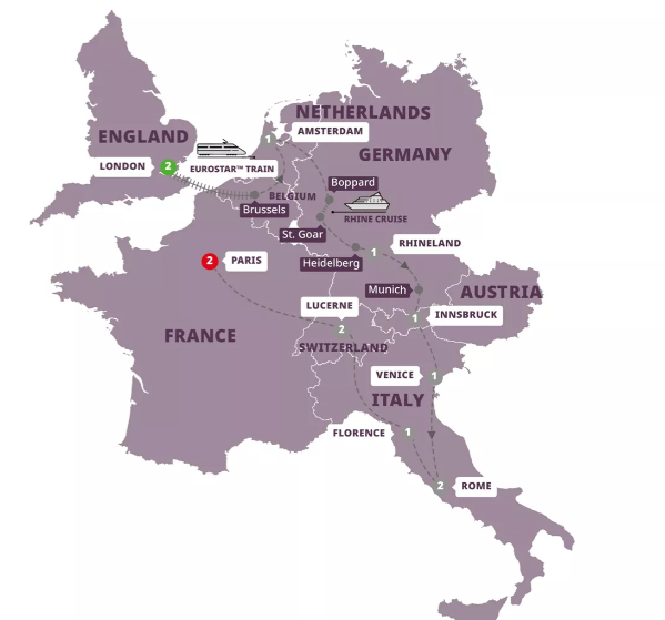 The tring-tring of bicycles sounds the start of your European Whirl. Kick back on the canals of Amsterdam and Venice, in the quiet lakeside beauty of Lucerne and among the Tuscan hills near Florence, with flavors of Italian Chianti setting the tone for an unforgettable trip.