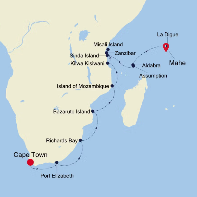 Savor South Africa’s wildlife and wines, breathe spiced island air, and tread the Seychelles’ soft sands. Across 20 days of adventure, you’ll experience the essence of the Rainbow Nation and uncover the ancient ruins and kaleidoscopic corals of Mozambique and Tanzania’s islands. Admire extraordinary biodiversity throughout as we head north from Mozambique to Aldabra, a remote atoll of giant tortoises. Finally, set sail for the paradise shores of the Seychelles.