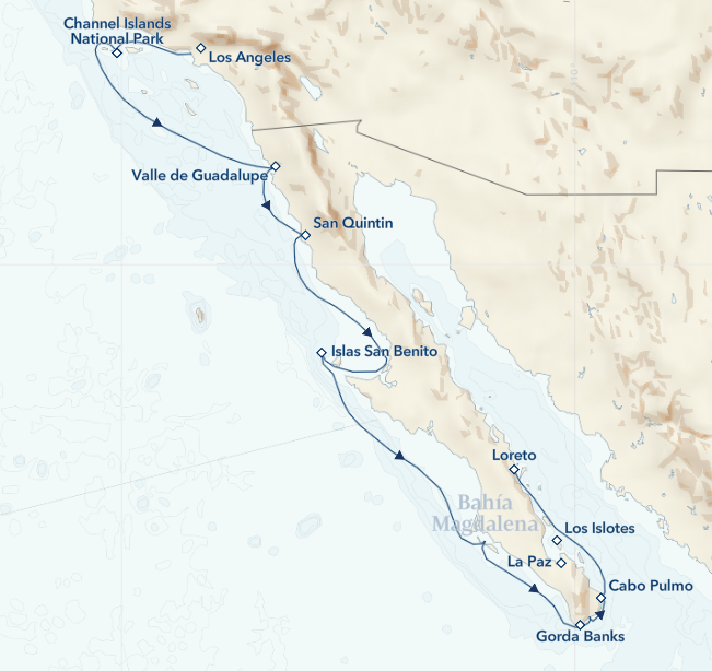 Migrate alongside humpback whales and numerous seabird species on a unique early-winter journey from Los Angeles to Loreto. Explore the Channel Islands’ intact wildness, thriving with endemic species. Sail to Ensenada and discover Mexico’s Wine Country—the Valle de Guadalupe. Spot a variety of species among the 25,000 birds migrating along the Pacific Flyway. Continue down the pristine coastline of Baja California, home to a panoply of sea life, untamed desert wilderness, and otherworldly sunsets.