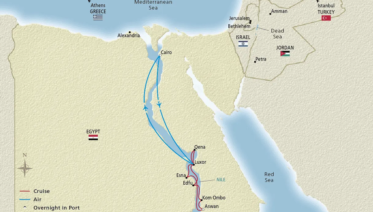 After breakfast, check out of your hotel and fly to your embarkation city. Luxor is set on the east bank of the Nile River and once served as the capital of Egypt’s New Kingdom. Today, it is a UNESCO World Heritage Site lined with beautiful colonial hotels and some of the world’s most ancient and significant ruins. Many consider this city, watched over by graceful single-sailedfeluccas plying the Nile, one of the world’s great open air museums. The sprawling Temples of Luxor and Karnak on the east bank are linked by the ancient Avenue of the Sphinxes. On the west bank, in the Valley of the Kings, lie the tombs of Egypt’s great pharaohs.