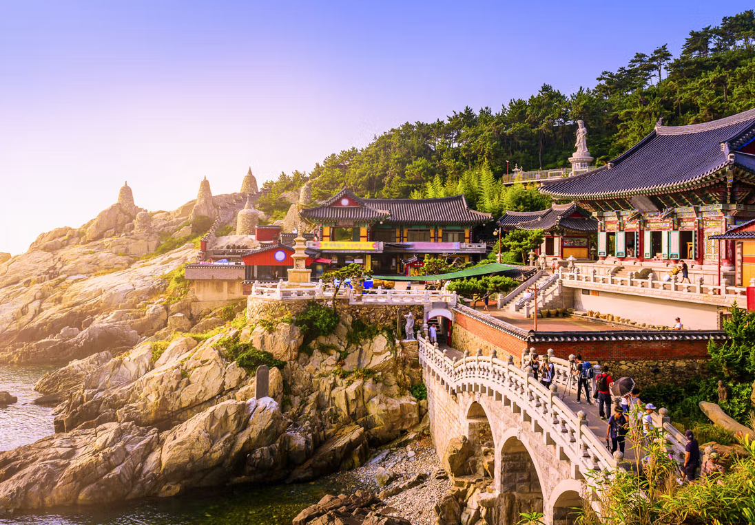 A tapestry of kaleidoscopic colors, intense seafood flavors, and urban beach bliss, Busan rolls across a glorious natural setting on the Korean Peninsula's southeast. One of the biggest and busiest ports in the world, 3.5 million people call South Korea's second city home, and the amiable locals help to lend the city its quirky, offbeat outlook. A spacious, playful, and cosmopolitan place, Busan is a lively, livable city, cradled by lush mountains and endless ocean scenery. Haedong Yonggung Temple nestles on a dramatic cliffside, just above the crumbling rocks and crashing waves of the East Sea. Dating back to 1376, the temple's multi-story pagoda is adorned with lions - each representing a different emotion. Elsewhere, lanterns glitter in the night sky around Mount Geumjeongsan, freshly released from the beautiful Beomeosa Temple, which was established in AD 678. The hillside shantytown of Gamcheon Culture Village has completed an improbable transformation, blossoming from a sea of makeshift homes for Korean war refugees, into a colorful explosion of creativity and curiosity. Local artists have been let loose to create interactive installations, and the entire area is now an expansive canvas for expression. Lose yourself among vibrant alleyways of flamingo-pink, lemon-yellow, and baby-blue painted facades in this unique area. Sample bibimbap, fiery-hot beef, and rice, from street food vendors, before relaxing on one of South Korea's best beaches - Haeundae's banana bend of sand. Metallic skyscrapers offer an unusual backdrop to this pristine expanse of golden powder and are mirrored by elaborate sandcastles and sculptures during the annual sand festival - when spontaneous water fights and firework displays also take place. Gwangalli Beach is another urban option, laying out spectacular views of the reaching Gwangan Bridge - the country's second largest bridge. At night, 16,000 bulbs bathe this "engineering marvel in color."