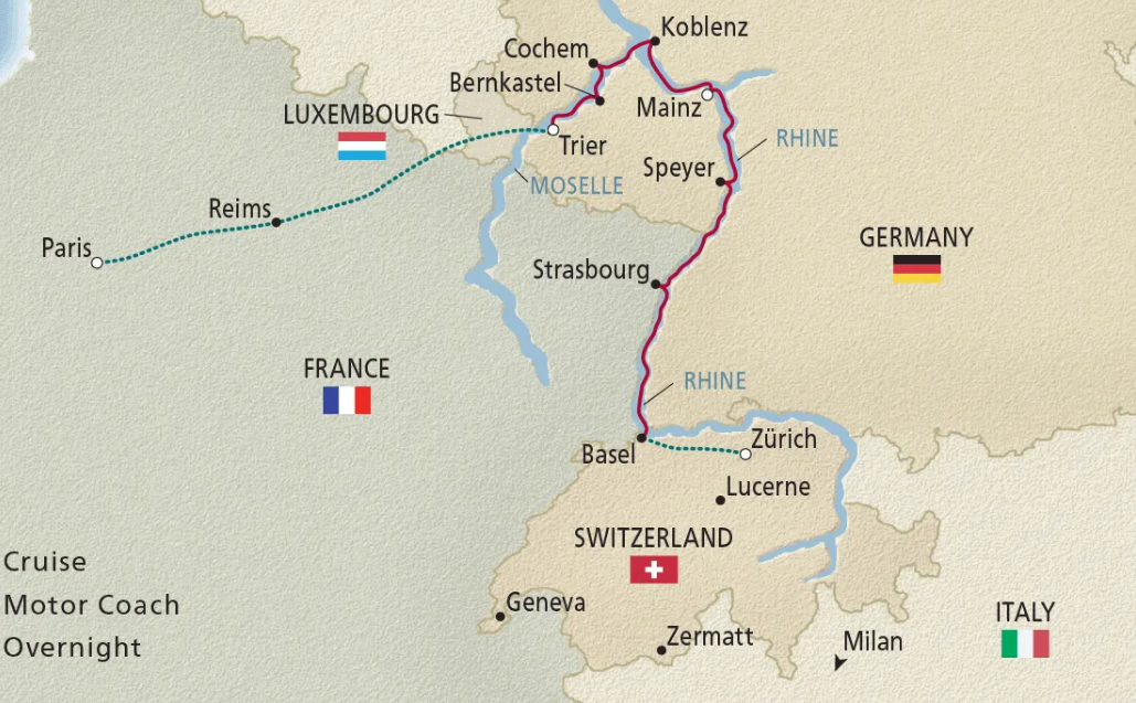 Pay your respects at the Luxembourg American Cemetery. Discover Roman Trier. Taste Moselle Rieslings and visit the wine town of Bernkastel-Kues. Enjoy scenic cruising past the town of Sankt Goar, home of the Lorelei Rock, and through the Rhine Gorge, a UNESCO Site. Visit fascinating Worms and the university town of Heidelberg. Vineyard-flanked slopes and historic cities, along with hotel stays in Paris and Zürich, make this 12-day cruisetour irresistible.