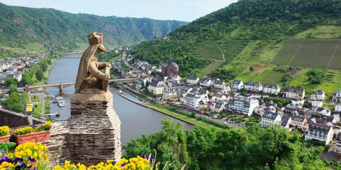 Perched on a hilltop above the city and the Moselle, a 1,000-year-old imperial castle is the signature landmark of Cochem. Its mighty rectangular keep and many small towers strike a dramatic pose against a curtain of green hills. In Cochem’s lively Old Quarter, the market square boasts old timber-framed houses that overlook Martin’s Fountain and the bay-windowed baroque Town Hall. In this historic center, the 15th-century St. Martin’s Church and the Capuchin monastery, which now serves as an artistic and cultural center, are all beautifully preserved. Wine taverns along the river offer a “green wine,” a very young wine.