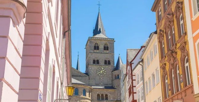 Koblenz is a traditional German city, founded more than 2,000 years ago. This former trading settlement rests on a massif of the Middle Rhine Highlands. Its cobblestone streets, wood-beamed houses adorned with flowers, ancient market square and medieval churches recall the fairy-tale Germany of old. At the German Corner, a massive equestrian statue of Prince William I observes the lovely riverside scene. The famed Teutonic Knights set up their first base here in 1216. The Romanesque Basilica of St. Castor, Koblenz’s oldest building, dates to 836.