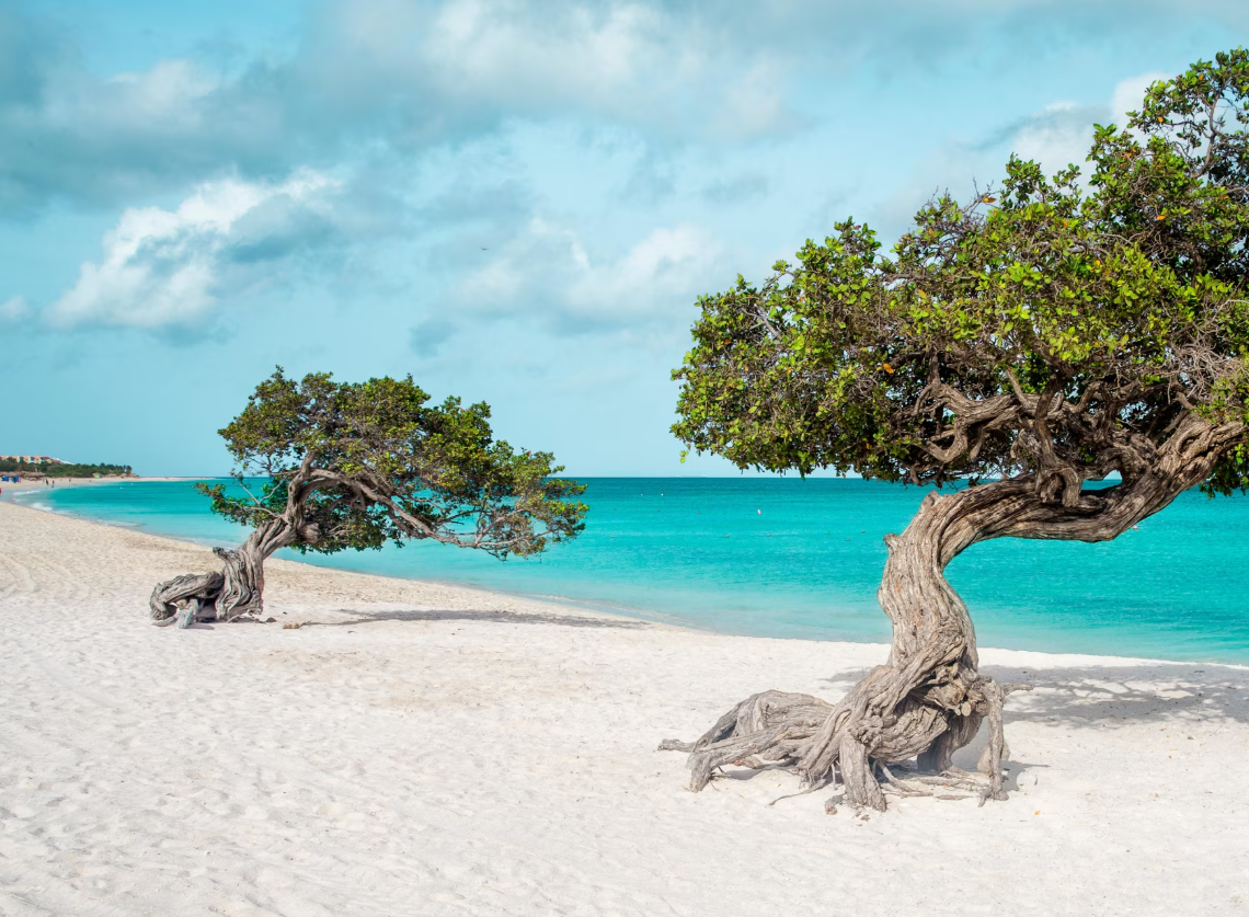 Dutch influence still lingers on this balmy Caribbean island, part of the former Netherlands Antilles until its independence in 1986. Aruba is a contrast: the island's arid interior is dotted with cactus and windswept divi-divi trees while secluded coves and sandy beaches make up its coast. Aruba's long and colorful heritage is reflected in its dialect. Called Papiamento, it is a tongue that combines elements of Spanish, French, Portuguese, Dutch, African and English.