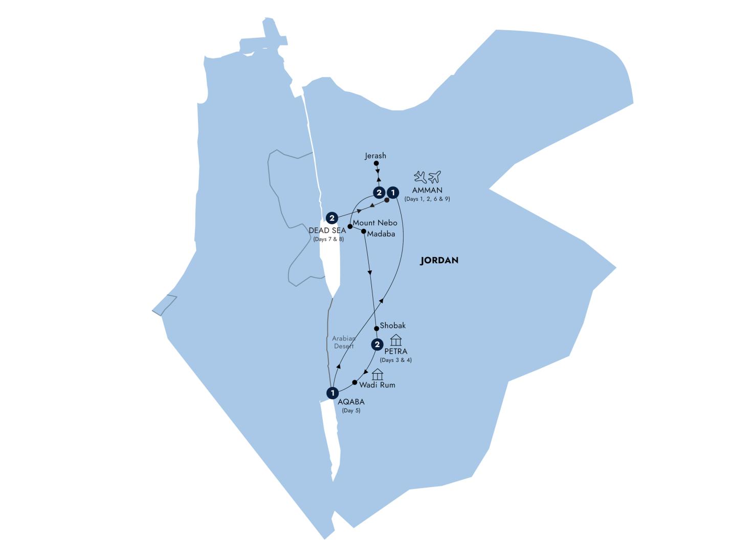 After breakfast, you are transferred to Amman Airport for your onward flight.