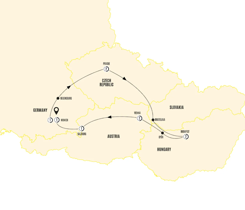 With the wonderful hospitality of your Bavarian hosts still fresh in your mind, you'll spend your final moments in Munich reminiscing over a journey filled with Europe's imperial capitals and all their incredible history, culture and nature. Say a fond pfiat di to your new friends and prepare for your onward journey home.
