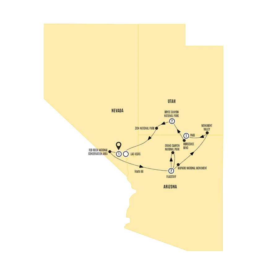 Traveling back to Vegas today you'll make one final stop at Zion National Park. Marvel at the soaring red and white cliffs and vast canyons that stand in stark contrast to the soft wildflower meadows and hanging gardens that can also be found here, as a result of the park's lower elevation in comparison to the others. Continue along the Virgin River Gorge for your final drive, reflecting on the incredible sights and experiences you've witnessed over the past seven days. Your trip ends at Harry Reid International Airport, or at the Costsaver post hotel for those extending their stay in Sin City.