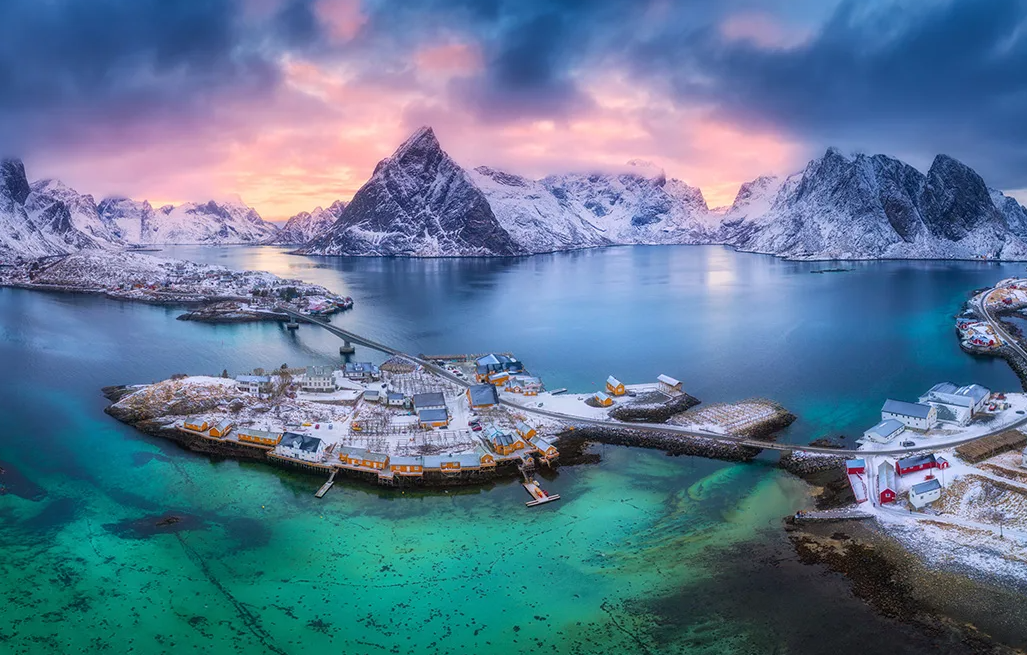 In winter, the Lofoten Islands transform into a snow-covered wonderland. Narrow fjords, hidden beaches between towering mountains, and picturesque fishing villages are all ideal to visit with a small ship like MS Spitsbergen.