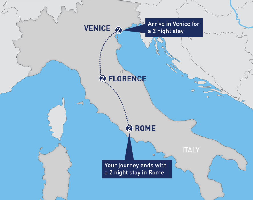 Explore Italy's historic cities; Venice, Florence, and Rome - and enjoy the beautiful passing scenery from the comfort of your train seat along the way! Spend a couple of nights in each city, admiring the stunning architecture, incredible art galleries and delicious cuisine. Transfer between cities by high speed train as the magnificent Italian countryside unfolds past your window.