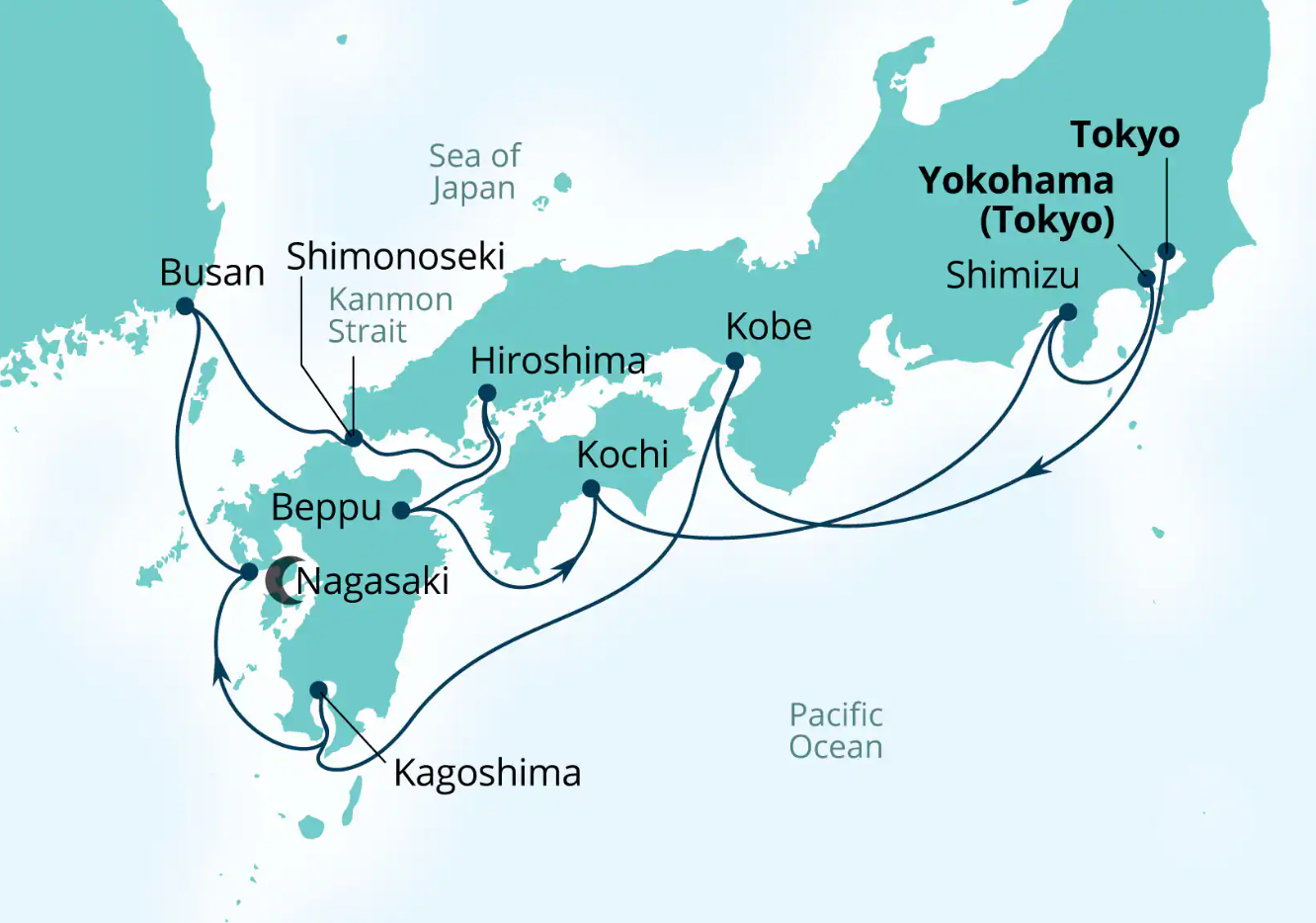 Tucked into a deep-cut bay at the southern end of Kyushu Island, this port has been compared to Naples in Italy, because it is also dominated by views of an active stratovolcano, Sakurajima. Enjoy its magnificence from the Shiroyama Observatory, or from the tranquil Edo-period Senganen Japanese Garden. Ishibashi Park has three Edo-era stone bridges, of five originally built at the end of the 19th century. Near the port is the impressive Kagoshima Aquarium, with seven floors of displays including the massive Kuroshio Tank maintaining a current that sustains large specimens including a whale shark.