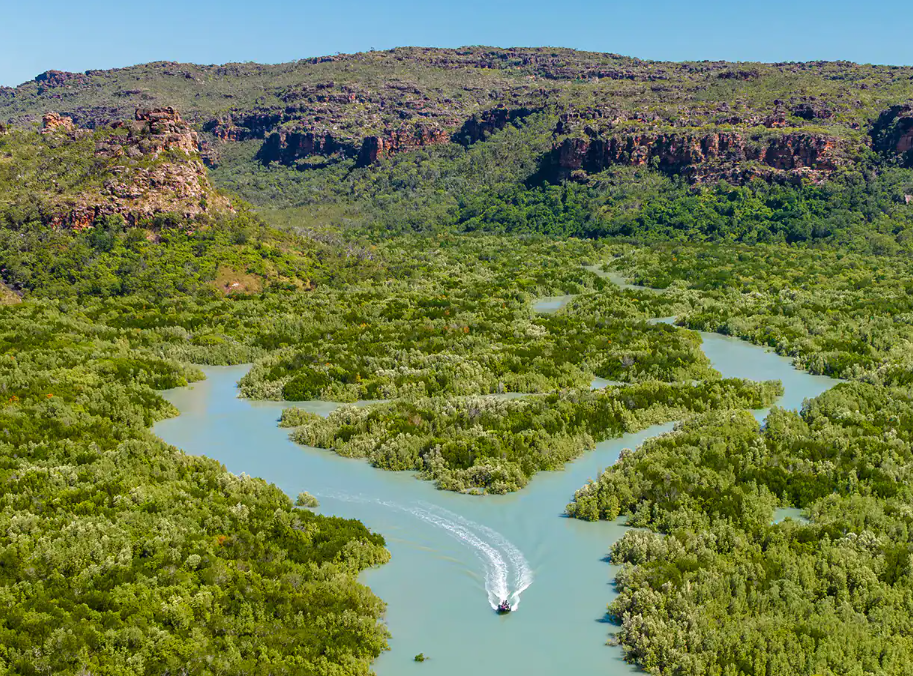 The Hunter River was named in 1820 by the explorer Philip Parker King aboard the Mermaid Cutter, while making charts in the area. The river was named after the surgeon on Mermaid, James Hunter. The river is home to a large mangrove estuary, that forms part of Porosus Creek (Crocodile Creek) and home to several bird species, Osprey, Brahminy Kite, and White-tailed Sea eagles. Mitchell River National Park is one of Kimberley's two national parks. The park lies in some of the most remote and inaccessible country in Australia. It is about 350 km north-east of Derby, and 270 km north-west of Wyndham. The park of 115,300 hectares lies in a remote part of the Kimberley and contains some of the region's scenic jewels. The Mitchell Plateau is one of the most scenic and biologically important areas of the State. Small patches of rainforest grow around the margins of the plateau, where they are protected from fire and receive additional moisture.