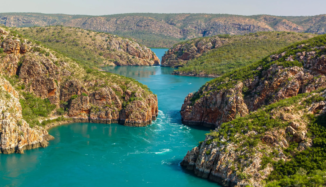Talbot Bay is the site of the Horizontal Waterfalls, which lie about 20 miles to the east of Cockatoo Island in the Buccaneer Archipelago. The effect of the waterfalls is created by the rapid tidal fall on the ocean-side of gaps in the sandstone cliffs. Waters on the inland side of the gaps cannot escape fast enough and so a ‘’horizontal waterfall’’ is created by the cascades, with water levels differing sometimes by several meters on either side of the gaps. The gaps themselves were once layers of siltstone in the strata of the sedimentary rock. It is through these gaps that tide movements push sea water to create the Horizontal Waterfalls.