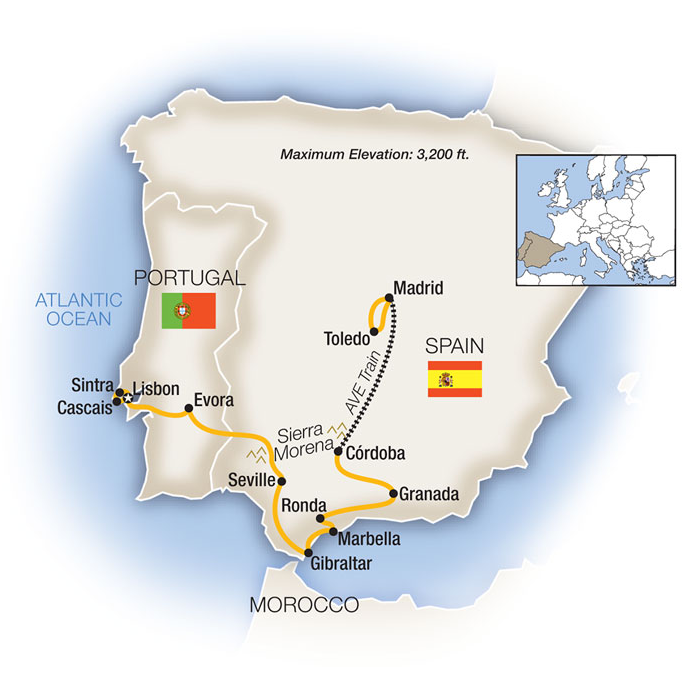 There's a lot of history to be rediscovered in Lisbon, and in the World Heritage Site town of Sintra, where rich cultural landmarks and traditions chronicle lifestyles of centuries past. Neighboring Spain entices with landscapes dressed in romance, from storybook villages in Andalucía to tales of "the Rock" in Gibraltar, flower-decked streets in Seville, and sun-kissed beaches in Marbella. The Moors lingered in Granada and Córdoba the longest, and the royals set up palaces, elegant city squares, the treasured El Prado in majestic Madrid and the magnificent Alhambra in Granada. Rediscover them all, in depth, for two glorious weeks