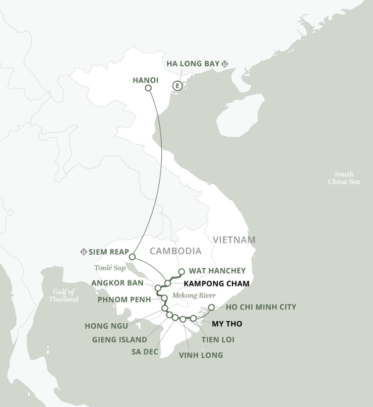 Two of the most beautiful, historic, and friendly places in all of Asia, dynamic Vietnam and pastoral Cambodia, are intriguing studies in contrast. Each possesses its own unique charm and social traditions, its own tragic history and complex past. Ho Chi Minh City offers a heady mixture of old and new, often surprising visitors with its charm. As the lifeblood of Southeast Asia, the Mekong teems with colorful floating villages. Phnom Penh, Cambodia’s thriving capital, is fast-forwarding to the future yet retains a provincial intimacy. And colorful Siem Reap provides the gateway to the vast UNESCO-designated jungle temple complex of Angkor Wat.