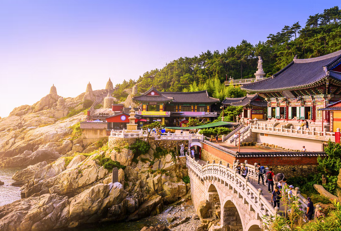 A tapestry of kaleidoscopic colors, intense seafood flavors, and urban beach bliss, Busan rolls across a glorious natural setting on the Korean Peninsula's southeast. One of the biggest and busiest ports in the world, 3.5 million people call South Korea's second city home, and the amiable locals help to lend the city its quirky, offbeat outlook. A spacious, playful, and cosmopolitan place, Busan is a lively, livable city, cradled by lush mountains and endless ocean scenery. Haedong Yonggung Temple nestles on a dramatic cliffside, just above the crumbling rocks and crashing waves of the East Sea. Dating back to 1376, the temple's multi-story pagoda is adorned with lions - each representing a different emotion. Elsewhere, lanterns glitter in the night sky around Mount Geumjeongsan, freshly released from the beautiful Beomeosa Temple, which was established in AD 678. The hillside shantytown of Gamcheon Culture Village has completed an improbable transformation, blossoming from a sea of makeshift homes for Korean war refugees, into a colorful explosion of creativity and curiosity. Local artists have been let loose to create interactive installations, and the entire area is now an expansive canvas for expression. Lose yourself among vibrant alleyways of flamingo-pink, lemon-yellow, and baby-blue painted facades in this unique area. Sample bibimbap, fiery-hot beef, and rice, from street food vendors, before relaxing on one of South Korea's best beaches - Haeundae's banana bend of sand. Metallic skyscrapers offer an unusual backdrop to this pristine expanse of golden powder and are mirrored by elaborate sandcastles and sculptures during the annual sand festival - when spontaneous water fights and firework displays also take place. Gwangalli Beach is another urban option, laying out spectacular views of the reaching Gwangan Bridge - the country's second largest bridge. At night, 16,000 bulbs bathe this "engineering marvel in color."