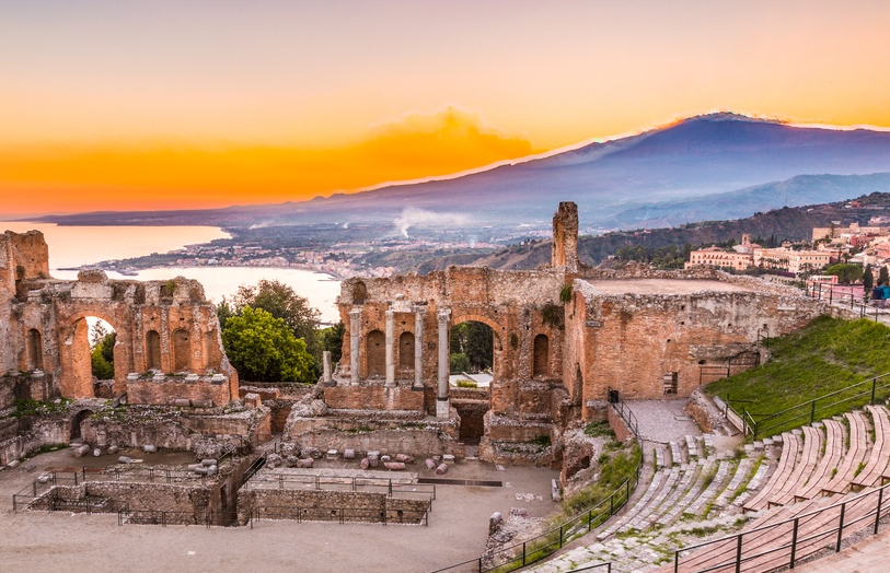 A lovely medieval town perched on high cliffs and situated next to the still active Mt. Etna, Taormina offers spectacular views over the bay and rugged coastline and lush crops of olives, citrus and grapes.