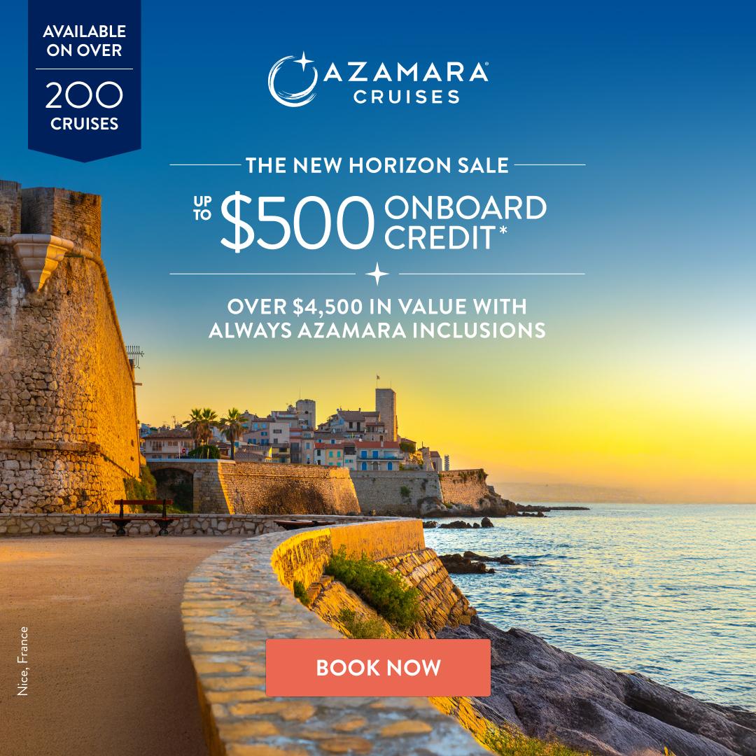 TERMS & CONDITIONS: The Q4 Brand Offer (“The New Horizons Sale” or the “Offer”) applies to new and individual bookings created between October 1, 2025 and December 8, 2025 (the “Offer Period”). The Offer applies to select sailings departing between October 30, 2025 and June 10, 2027 (the “Sailing Window” or “Range”). The Offer provides up to $500 Onboard Credit (OBC) per cabin to be used onboard. The Offer provides guest(s) with up to $500 Onboard Credit (OBC) per cabin to be used onboard. The amount of OBC received per cabin will be determined by the length of the sailing. Sailings that are 12 or more nights will receive $300 OBC per cabin for Ocean views or Interior, $400 OBC per cabin for Verandas, and $500 per cabin for Suites. Sailings that are 11 nights or less will receive $200 OBC per cabin for Ocean views or Interior, $300 OBC per cabin for Verandas, and $450 per cabin for Suites. The Offer has limited combinability. Open for purchases made in U.S., Canada, and select global markets. Void where prohibited. The Offer may be withdrawn at any time. Prices and offers are subject to change and availability. Azamara Cruises may adjust fares, fees, or correct errors anytime without notice. See www.Azamara.com/brandoffer for the list of applicable sailings and www.azamara.com/brandofferterms for additional terms and conditions. 2025 Azamara. Ships registered in Malta. “Change the Way You Sea” is an international service mark of SP Cruises OpCo Limited.